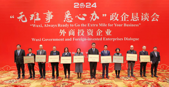 為廣泛聽(tīng)取企業(yè)意見(jiàn)建議,持續(xù)打響“無(wú)難事 悉心辦”優(yōu)化營(yíng)商環(huán)境品牌,2月23日,無(wú)錫市政府邀請(qǐng)近30家在錫重點(diǎn)外資企業(yè)代表召開(kāi)懇談會(huì),面對(duì)面傾聽(tīng)企業(yè)訴求和對(duì)政府工作意見(jiàn)建議,并為“無(wú)錫市十佳外資企業(yè)”頒獎(jiǎng)。我司榮獲該項(xiàng)殊榮,集團(tuán)黨委書(shū)記張宏飛代表企業(yè)參加會(huì)議并交流發(fā)言。