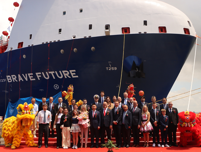 揚子三井代表宋書明先生表示:“繼今年1月“Brilliant Future”號成功交付后,我們迎來了第二艘雙燃料LEG運輸船的交付。值此機會,我們衷心感謝Braskem的Cristiane女士、Hardi先生,以及Ocean Yield的Andreas先生。感謝Hartmann集團的Hartmann博士、Adami船長、Ionut Cornea先生、龍葉飛先生,感謝AC-INOX的Sascha先生。感謝整個Hartmann團隊始終如一的支持,也感謝DNV船級的專業(yè)指導(dǎo)。同時,向所有參與本船建造的YAMIC員工致以誠摯謝意。未來,我們將繼續(xù)與各方緊密合作,為船東研發(fā)建造更加安全、更加綠色、更高性能的綠色能源氣體運輸船產(chǎn)品。”教母Cristiane Rego女士為新船命名并擲香檳禮,現(xiàn)場鞭炮齊鳴、禮花綻放,汽笛共鳴,龍獅共舞,祝福新船和船員航行平安,勇敢前行,為船東和租家?guī)砗眠\與財富,也為Hartmann、DNV和揚子三井贏得榮耀,帶給所有人勇氣與希望。Hartmann代表Adami Ulrich表示:“衷心感謝揚子三井團隊。揚子三井憑借嚴謹?shù)墓芾砗椭苊艿挠媱?,確保了本船的順利交付。我們對揚子三井未來的發(fā)展充滿信心,也感謝所有為此付出努力的員工?!?/span>Braskem代表Hardi Schuck表示:“正是由于揚子三井在船舶建造過程中的專業(yè)精神與奉獻,讓我們對Brave Future感到無比自豪?!?/span>