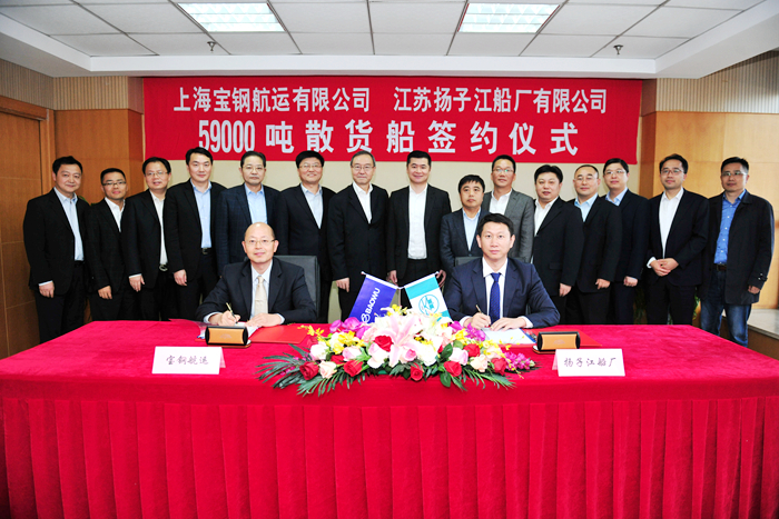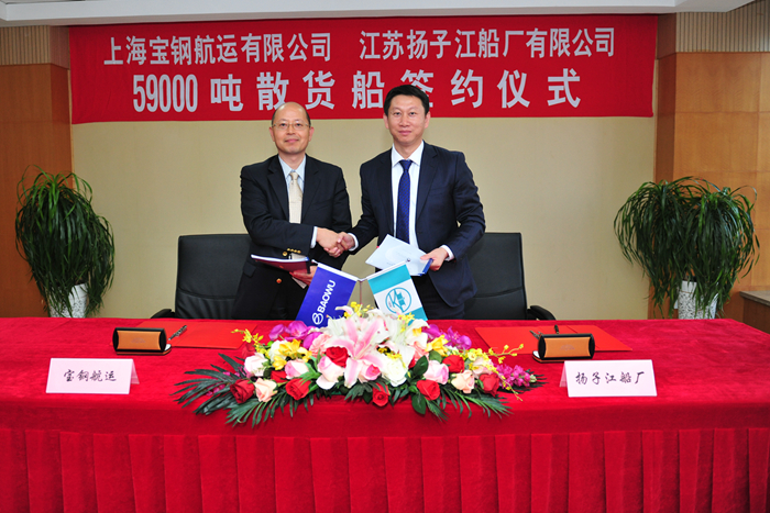▲11月13日下午,我集團(tuán)下屬江蘇揚(yáng)子江船廠有限公司與上海寶鋼航運(yùn)有限公司簽署了2艘59000噸散貨船新造船合同。集團(tuán)董事長(zhǎng)任樂(lè)天先生,寶鋼資源(國(guó)際)有限公司董事長(zhǎng)張典波先生,寶鋼資源(國(guó)際)有限公司總裁陸克從先生,我集團(tuán)副總經(jīng)理宋書明先生,副總經(jīng)理杜成忠先生,以及來(lái)自寶鋼資源、寶武原料、寶鋼航運(yùn)、中聯(lián)海運(yùn)、上海船舶研究設(shè)計(jì)院、中國(guó)船級(jí)社等領(lǐng)導(dǎo)和重要嘉賓出席簽約儀式。